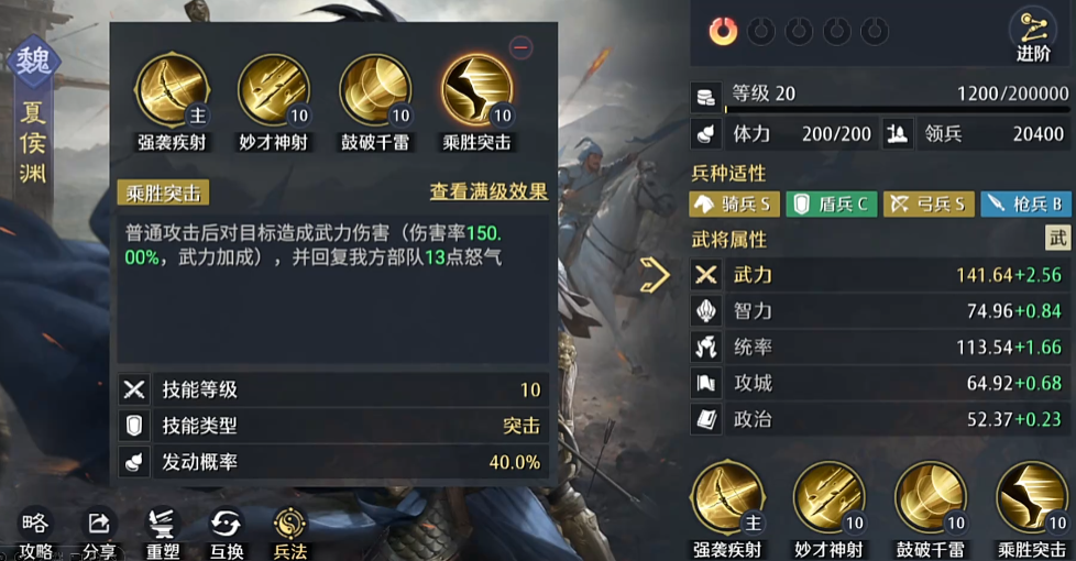 为了进一步提升出手频率,建议为夏侯渊配备“乘胜出击”这一突击类技能。该技能在对目标造成伤害后可恢复13点怒气,显著加快主动战法的循环节奏。而由于张辽自身具备20%概率进入连击状态的能力,且连击期间还可额外获得15点武力值加成,因此每一次额外行动都有可能再次激活夏侯渊的突击机制,形成良性循环。