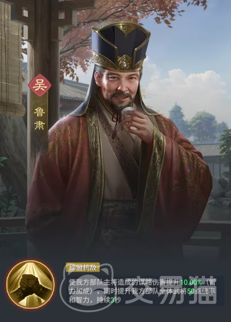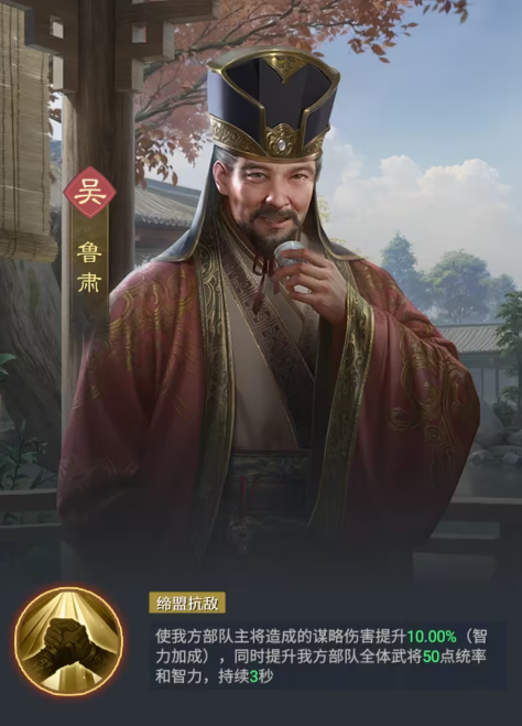 鲁肃在此阵容中担任辅助角色,推荐携带弓兵专精与“远程打击”类技能,以最大化兵种加成效果。当其智力属性得到提升后,能为全队带来攻击与防御层面的增益。同时,他也能通过智谋加持提高队友的谋略强度,并借助“军医”类技能实现持续性的兵力比例恢复,确保团队在长时间交战中仍保持良好状态。