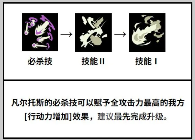 在副属性选择上,应重点关注暴击抗性、基础防御值以及体力百分比这三项关键指标。这些属性直接影响凡尔托斯在战斗中的持续作战能力。作为前排角色,除了依赖初始面板数据外,后续培养也应侧重于提升防御端的表现。为了更快释放其强势效果,在技能升级顺序上建议优先提升必杀技,其次是技能2,最后升级技能3。这一顺序可确保其核心功能尽早成型——其必杀技能够为我方攻击力最高的单位提供额外行动机会,从而带动全队节奏优势。