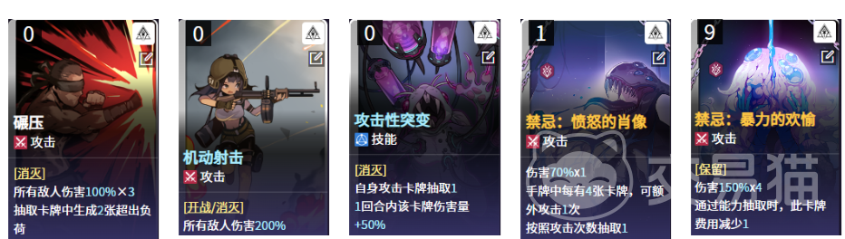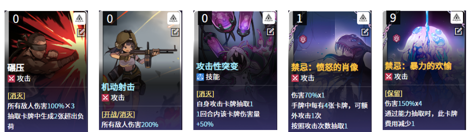主打输出的角色应重点关注“碾压”、“机动射击”、“攻击性突变”、“禁忌愤怒的肖像”和“禁忌暴力的欢愉”。“碾压”是单体爆发的核心之选,伤害倍率突出,其副作用在可控范围内,强烈建议必拿。“机动射击”可对全体敌人造成200%的伤害,适用于清理大量杂兵场景。
