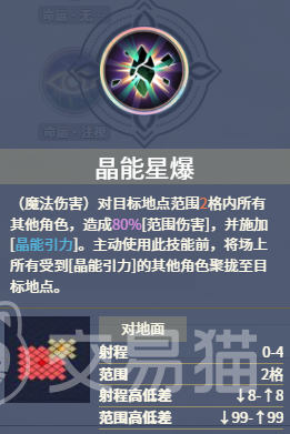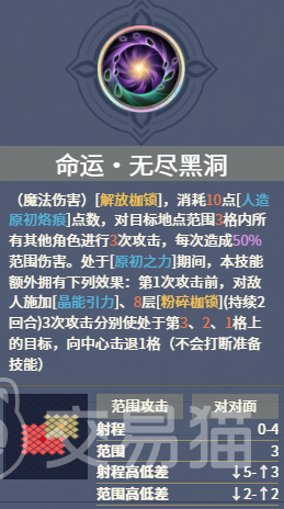 右线技能“命运无尽黑洞”则是一个高消耗(10点)但威力惊人的主动技,能对三格范围内所有敌人发动三次独立攻击,每次造成50%魔法伤害。首次命中时还可附加“晶能引力”状态,进一步强化控制链。值得注意的是,每次攻击成功后会将目标向中心位置推动一格,形成有效的聚拢效果。尽管该技能不具备打断敌方施法的功能,但由于其稳定的范围输出与状态叠加能力,在多数PVE及部分PVP场景中表现优于纯辅助路线。