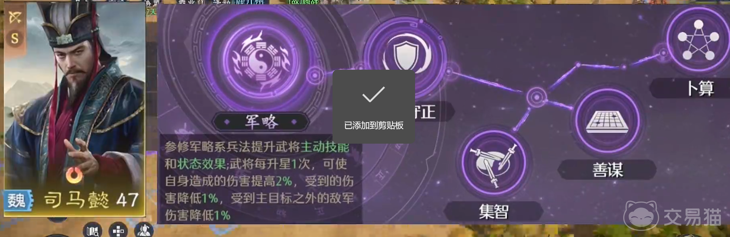 在兵种选择方面,推荐全队统一配置为盾兵,以此激活3S兵种加成,使全体属性获得30%的额外提升。军法配置上需根据角色定位差异化分配:周瑜优先点选强化输出类军略;司马懿推荐选择计成得势、集智、善谋、奇谋等项,进一步提升策略伤害与中毒频率;华佗则应搭配励军、诱敌而击、乐善、奋主、活气等增益型军法,强化治疗效果与战场控场能力。合理的兵种与军法组合,能让火毒盾在实战中兼具抗压性与压制力。