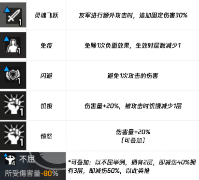 首先来看正面词条部分。不屈:触发后可使受到的伤害降低20%,该效果可在同一回合内多次叠加,例如两层减伤40%,三层则达60%;但需注意,玩家每完成一个回合行动后,所有叠加层数将被清空。