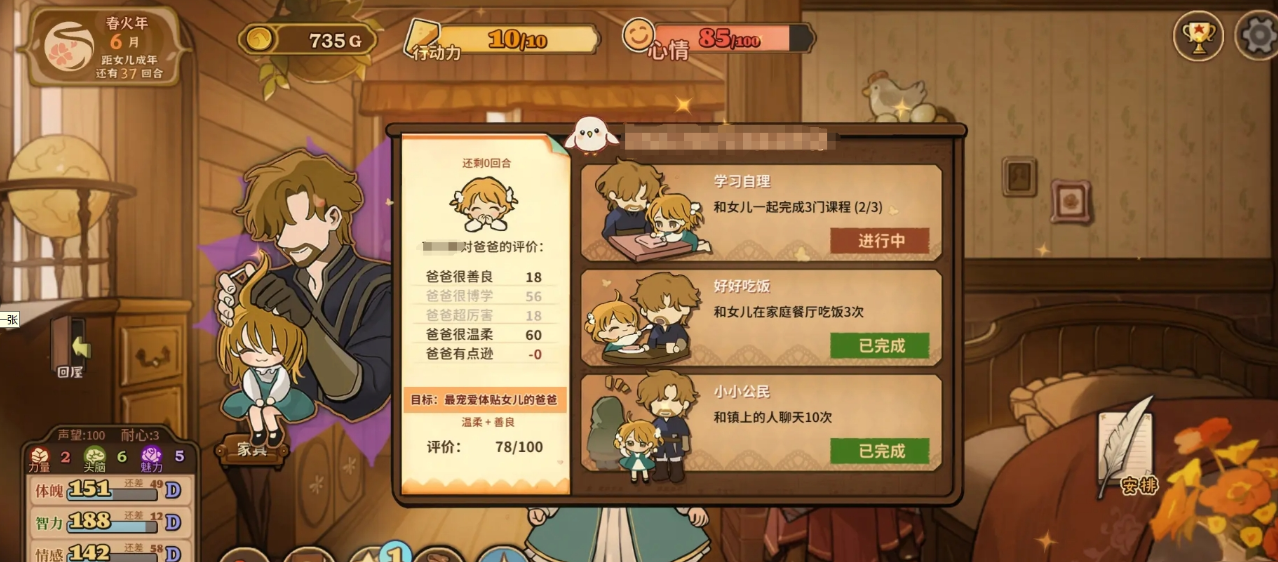 游戏初期,女儿的基础数值较为薄弱,通常难以满足高阶紫色学院的准入要求,这是正常设定。此阶段的核心目标应聚焦于提升生活技能与基础素质。建议优先选择烹饪、手工、劳动以及基础探索类课程,这类技能不仅能有效积累关键属性,还能触发早期事件,为后续进入特定学院创造前置条件。此时应避免过早投入战斗相关训练,因其耗时较长而回报较低,不利于资源的高效利用。