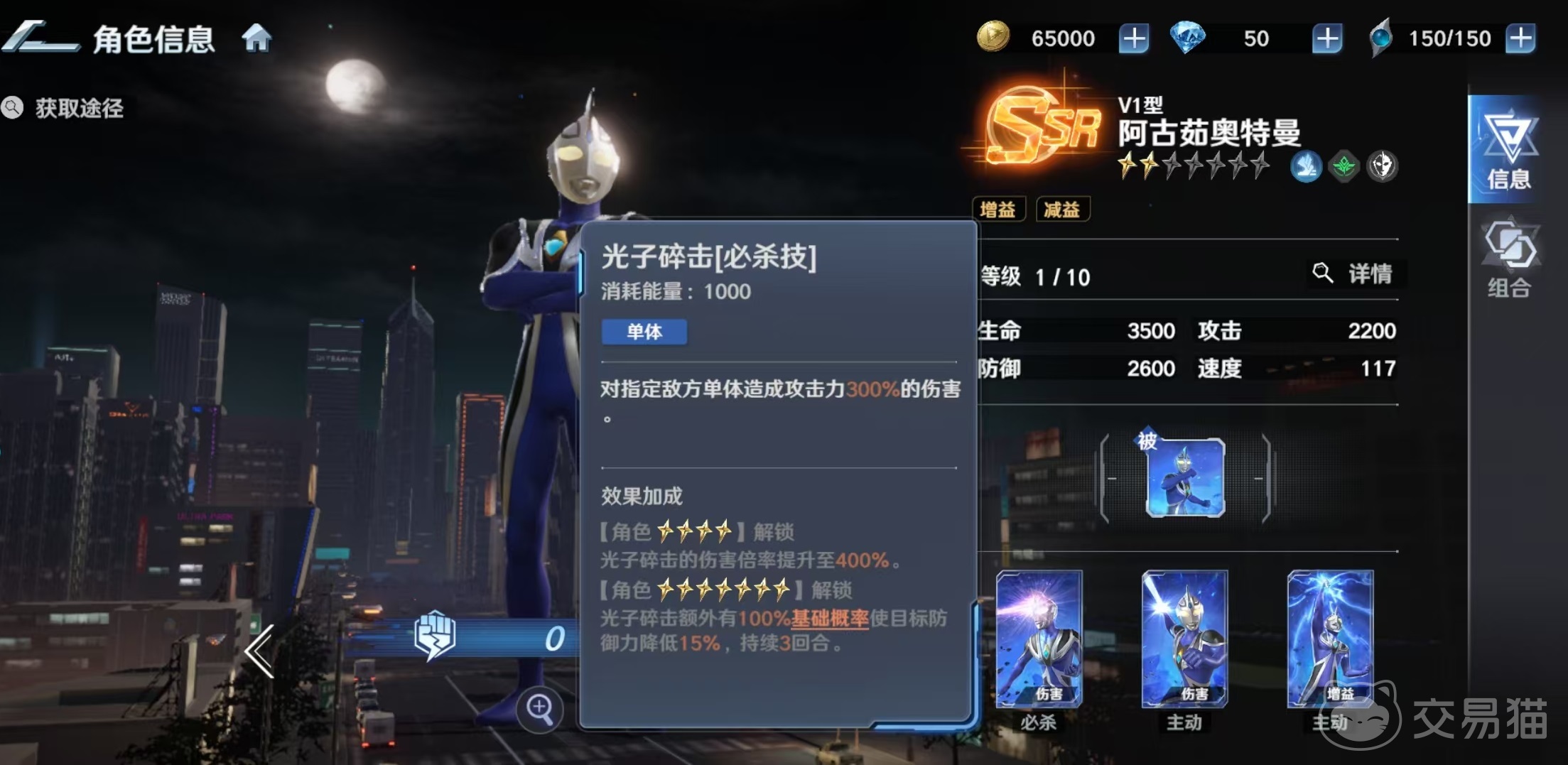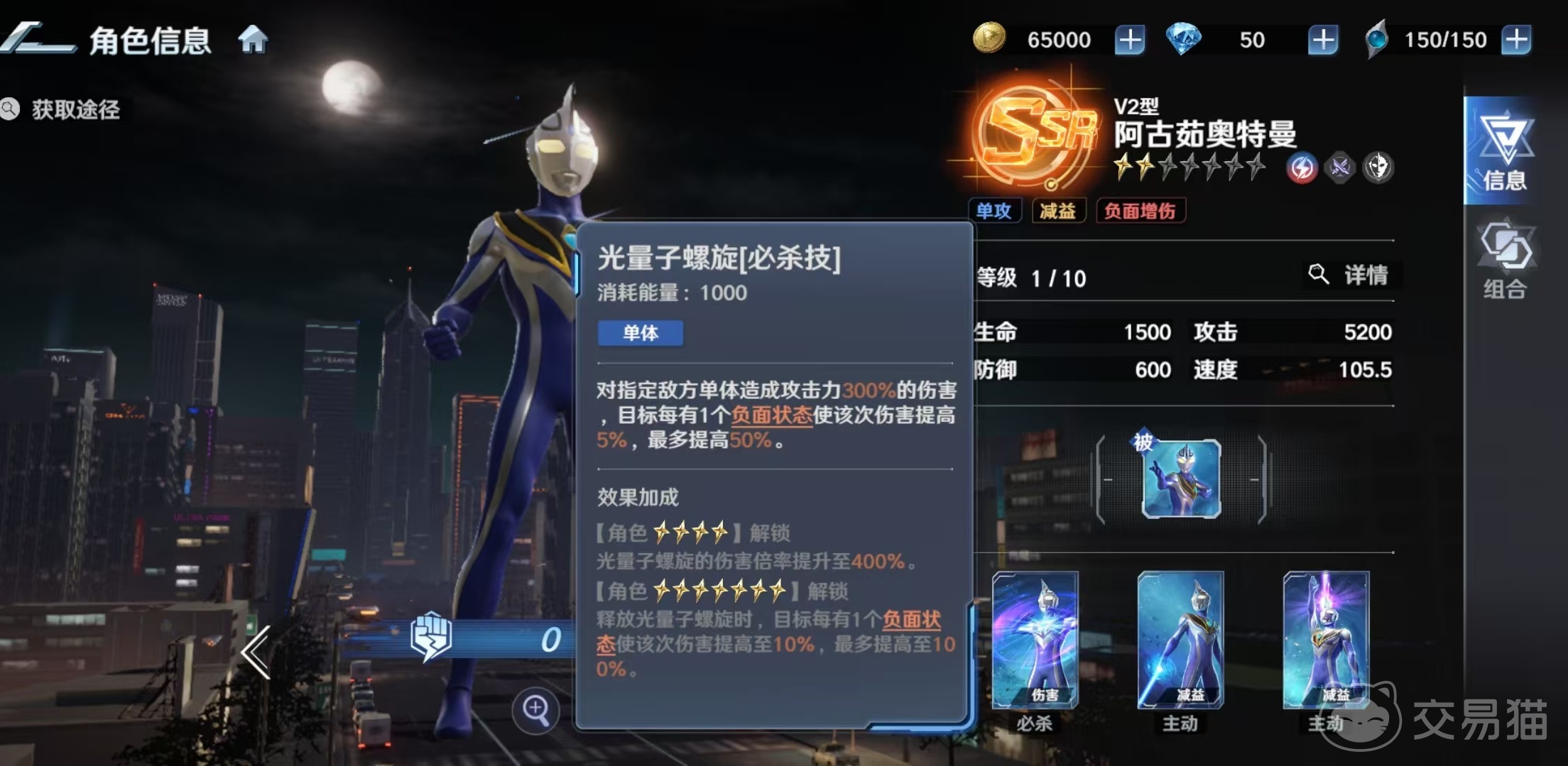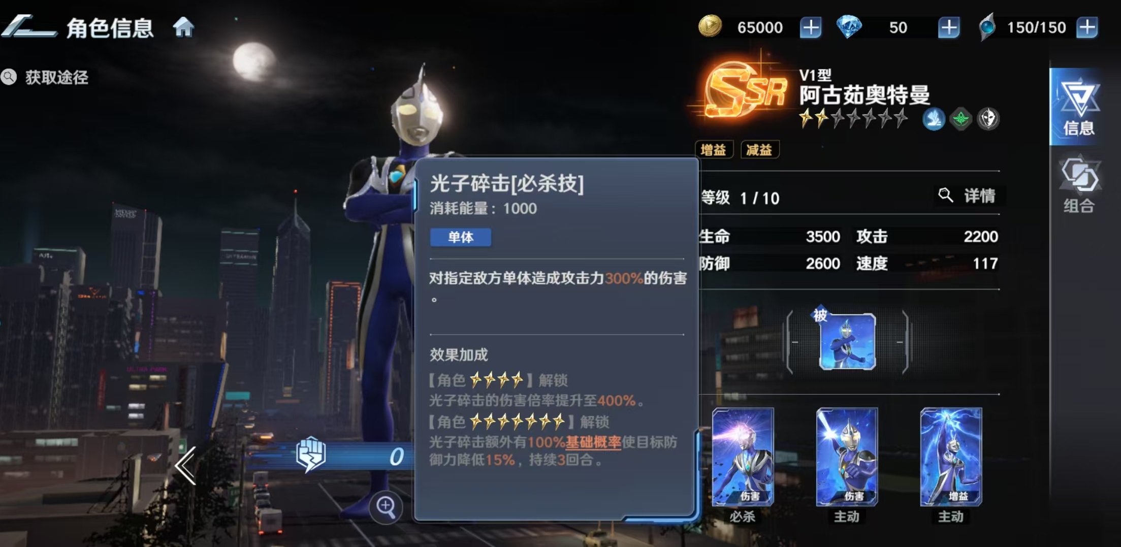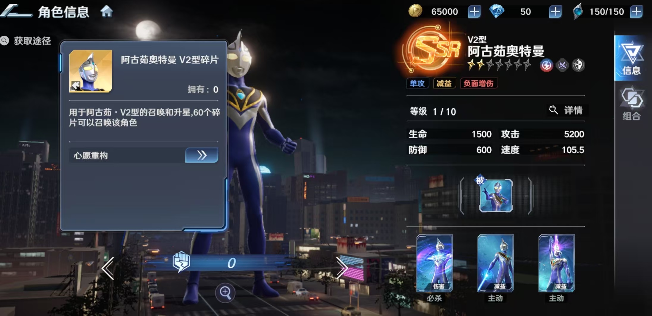 在本作中,阿古茹奥特曼拥有两个形态版本:阿古茹奥特曼V1型和阿古茹奥特曼V2型,两者均为SSR稀有度角色,在战斗定位和技能机制上各有特色。首先来看阿古茹V1型,其获取途径较为多样,玩家可以通过标准重构、友情重构、心愿重构三种抽卡模式进行抽取,此外还能在竞技场商店中直接兑换获得。这意味着即使非酋玩家也能通过积累代币稳定入手,整体获取难度较低,适合前期快速组建阵容。