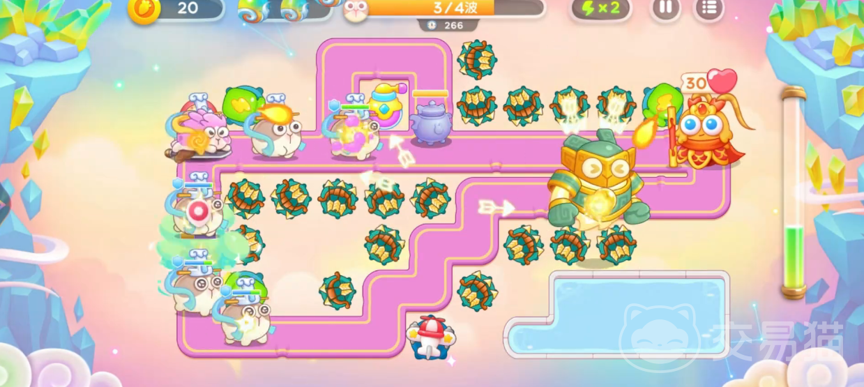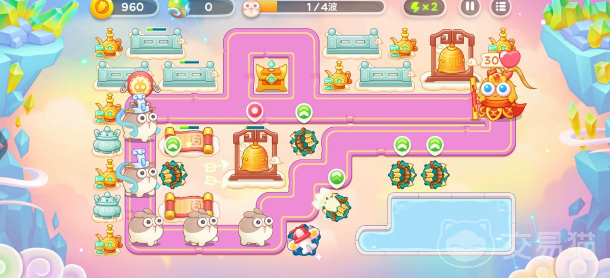 在击败首波兔子后,建议迅速部署瓶子炮,集中火力攻击大钟与酒壶等关键道具。瓶子炮对酒壶具有良好的打击效果,配合已有的2级多重箭,可协同清理宝箱、香炉及剩余酒壶。此时若条件允许,可将毒针塔升至3级以增强控场能力。只要合理配置足够数量的2级多重箭,整体防守强度即可满足需求。当所有地图道具被清除后,合体星君将正式现身。