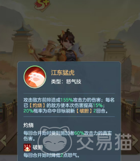 其怒气技“江东猛虎”可对敌方前排目标发动群体打击,造成155%攻击力的范围伤害,若场上存在已被施加灼烧效果的敌人,每位都能使该技能伤害提高15%,配合灼烧体系时输出极为惊人。此外,该技能还有20%概率附加持续两回合的“破胆”状态,使目标在每回合开始时损失2点怒气,有效延缓对手释放大招的节奏。
