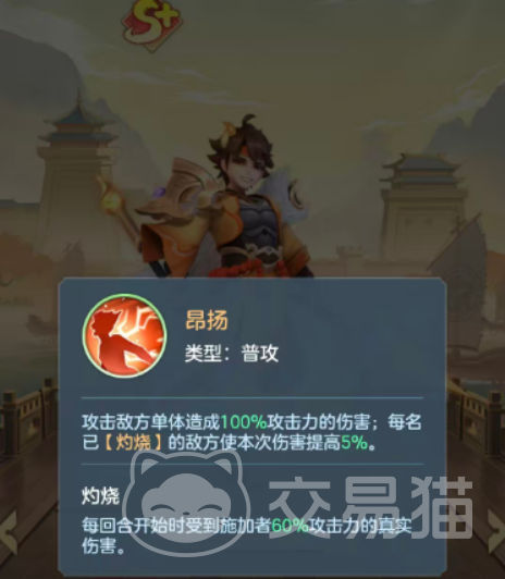 孙策的基础普攻名为“昂扬”,可对单一敌人造成等同于自身攻击力100%的伤害,且每存在一名处于灼烧状态的敌方单位,此次攻击的伤害将额外提升5%,为他在特定阵容中提供了可观的增伤空间。