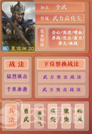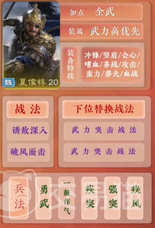 该组合更适合配置为骑兵部队,利用机动性与爆发力结合的优势快速切入战场节奏。其中,张辽在前期即可提供可观的物理属性增幅,后期配合专属战法更能强化团队作战效率。在具体战法选择方面,夏侯惇优先装配“诱敌深入”与“破风而击”,以增强控制与输出衔接;张辽则推荐携带“整军伤武”和“虎豹骑”,强化队伍稳定性与突击能力;夏侯渊适合配备“猛烈强击”与“千里奔袭”,进一步放大远程打击与突进效果。