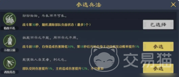军略派系则更适用于拥有强力主动战法的武将,例如关羽、吕布、诸葛亮等。这类兵法通过提高主动技能的触发效率或增强其伤害倍率来发挥作用。代表性兵法包括“临危不乱”、“示敌以弱”与“诱敌而击”,它们通常以百分比形式提升特定战斗状态的成功概率,且增幅较为可观,在实战中具备较高的战术价值。