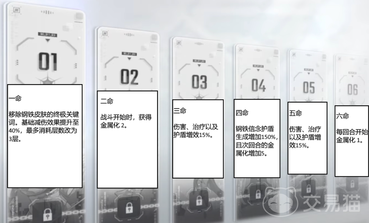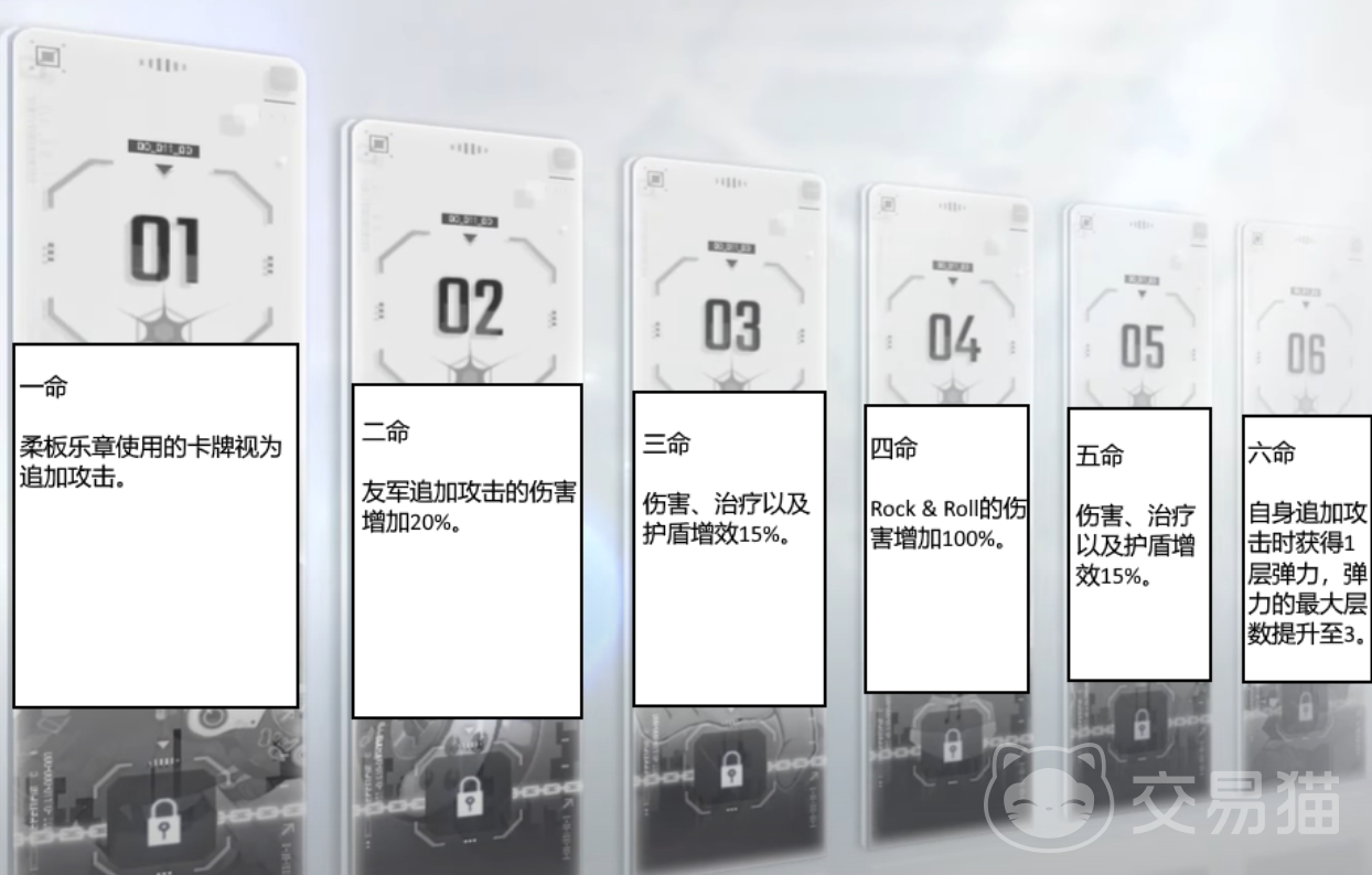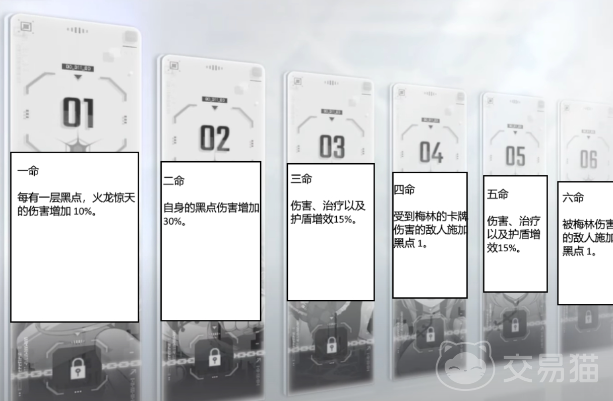 另一位角色梅铃的命座设计同样具有鲜明特色。她的六个命座分别对应不同的战斗增益:第一命座提供10%的伤害提升;第二命座使黑点相关的伤害提高30%;第三命座对伤害、治疗和护盾三项基础属性各提升约15%;第四命座则增强了对受梅林卡牌影响敌人的压制力,额外增加一个黑点标记;第五命座再次为三项属性带来15%的增幅,叠加第三命座后总计可达30%;第六命座进一步扩展黑点机制,使每次造成伤害时额外生成一点黑点,显著提升持续输出能力。