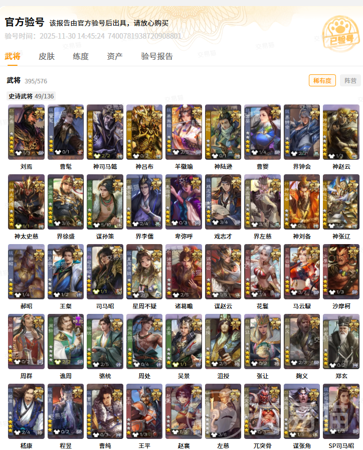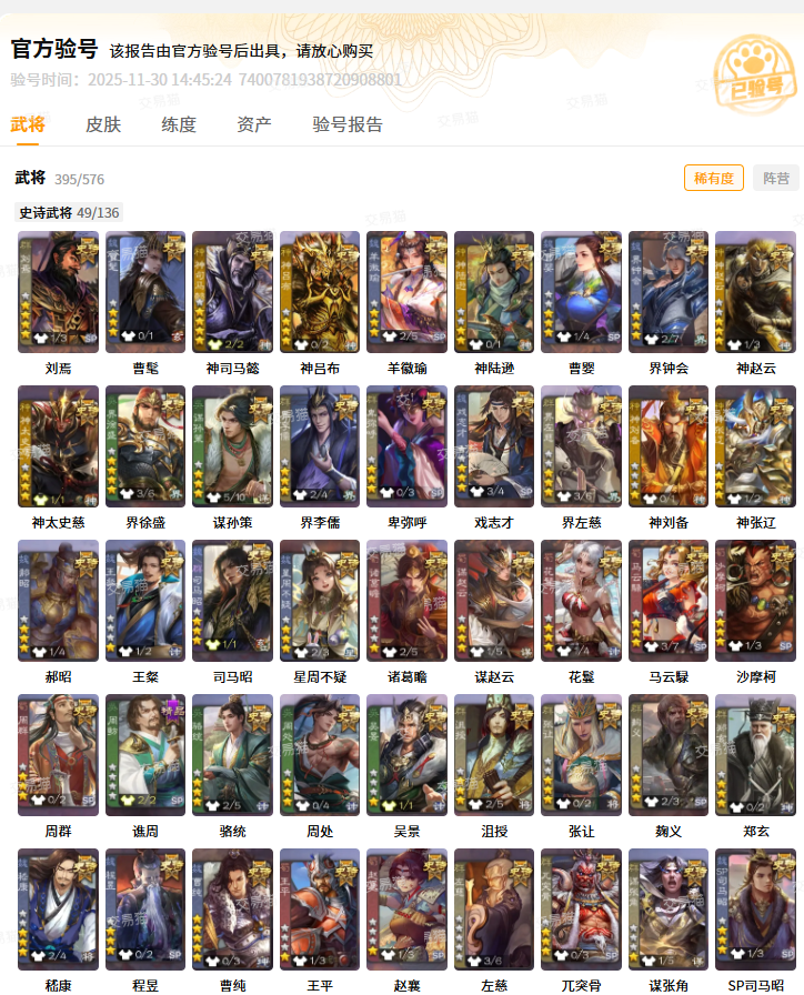 值得一提的是,针对三国杀这款游戏平台还提供了验号服务,会仔细的核对大家账号的真实性与资源,然后一一展示在账号信息内,让买家可以详细的查看,也更方便于买家检索时能够选到符合自己心意的账号。