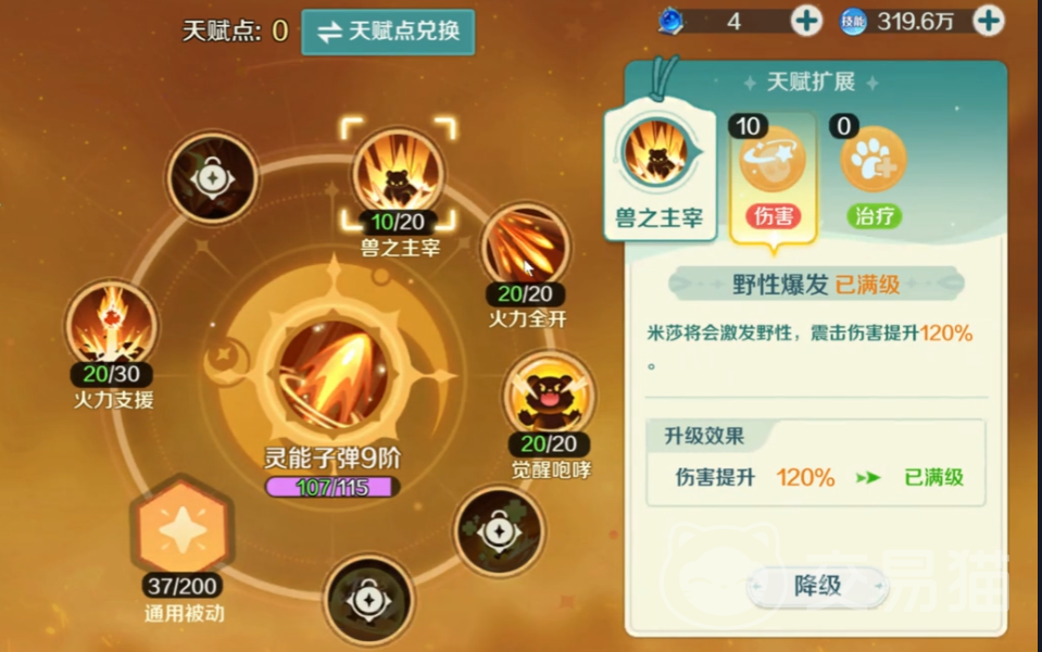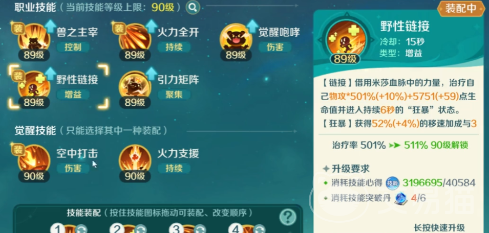 关于天赋加点方面,在PVE环境中应优先点满火力全开,随后补足兽之主宰等级。若有队伍奶妈支援,可忽略治疗类被动;反之则建议投入通用被动中的枪火之力以提升攻击力。觉醒咆哮需全部点亮,紧接着强化火力支援的两项伤害加成,减速效果可视情况选择性加点。而在PVP或团战向配置中,核心应聚焦于野性链接及其相关增益,确保免控与恢复效果完全解锁。尤其是野性链接激活后可提供60%增益提升及长达三秒的百分百免控状态,这一特性在面对多重控制技能时极为强势,远超普通解控手段。