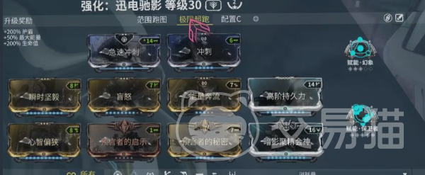 首选的构建思路是兼顾实用性与运行效率。推荐配置包括能量奔流、腐蚀投射、高阶持久力和预言者的远见这四个核心MOD。赋能方面建议选择保卫者与充沛:前者增强生存能力,降低意外阵亡风险;后者确保能量供给充足,有效缓解高速移动带来的高能耗问题。此套组合可提供200%的生命值与护盾加成,配合50%的最大能量提升,在频繁位移过程中显著提高容错率。