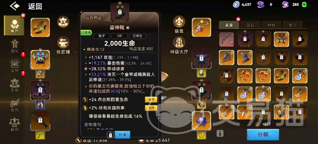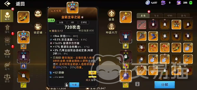 首先从武器选择入手,战神神力弓是弓箭流的核心装备,无需考虑其他替代品。该武器提供190%的群体伤害加成,并兼容连射和蓄力两种攻击模式。使用连射时可触发388%的攻击效果,实现高效清场;切换至蓄力模式后,伤害提升至188%,适合应对高血量目标。在整体配装思路上,应优先强化移动速度、攻击力以及生存能力,确保每一部件都能为刻印增益服务。鞋子推荐选用道神靴,基础属性提供1000点攻击与28%移速加成,更重要的是其刻印效果——击杀金甲单位后,移动速度额外提升33%,且暴击伤害根据移速加成的30%获得额外增幅。