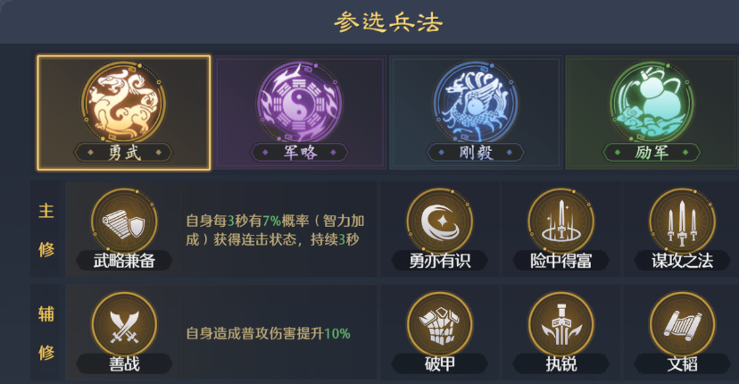 武将养成分为多个阶段。初期获得的多为紫色品质角色,如关羽、诸葛亮等,适合过渡期使用。无需急于抽取高稀有度武将。当武将达到15级并开启装备系统后,即可挑战高级蛮族单位,获取装备材料。材料累积至25级时,可激活兵法系统,搭配勇武、军略刚毅、励军等多种兵法组合,进一步增强实战能力。