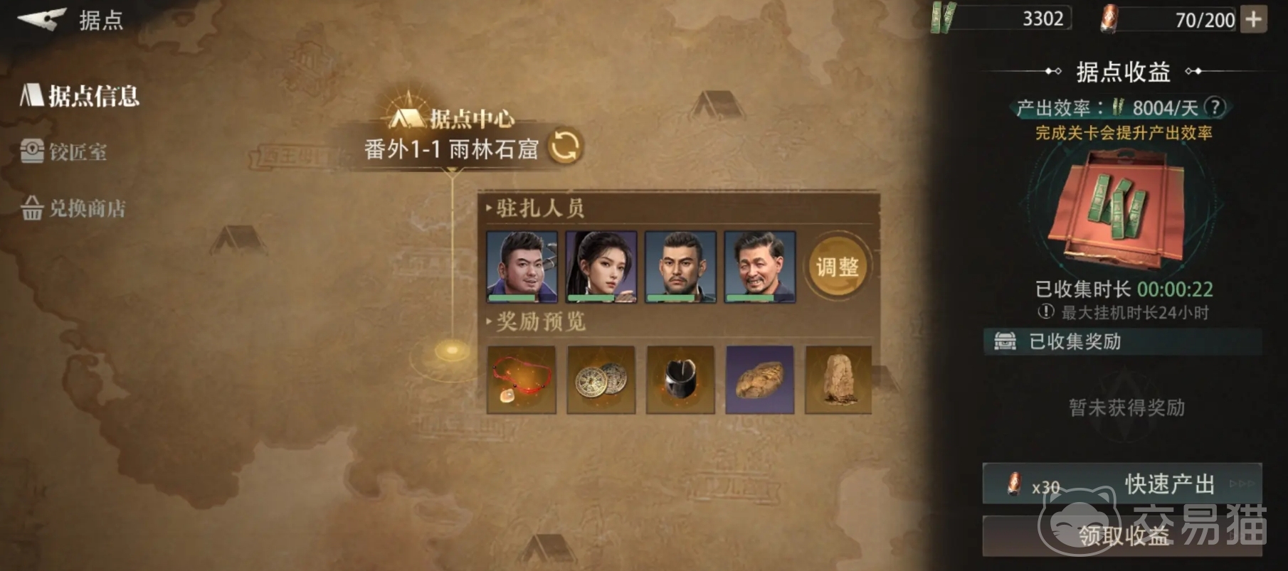 目前游戏中辟邪物的主要获取途径有两种。其一是通过推进主线剧情和挑战秘门关卡,在地图中的宝箱内随机拾取,部分主线任务也会直接奖励辟邪物。不过此类方式产出的物品品质普遍偏低,适合前期过渡使用。真正稳定的高阶资源来源是番外玩法——当玩家解锁特定番外内容后,可将其设为专属据点,持续获得挂机收益,其中就包含各类辟邪物。挂机最长可持续24小时,达到时限后需手动领取奖励才能继续产出。此外,玩家也可选择消耗30体力立即完成一次产出,加快收集效率。