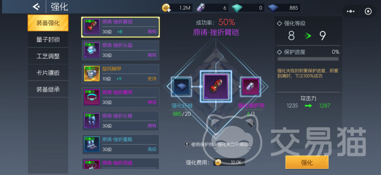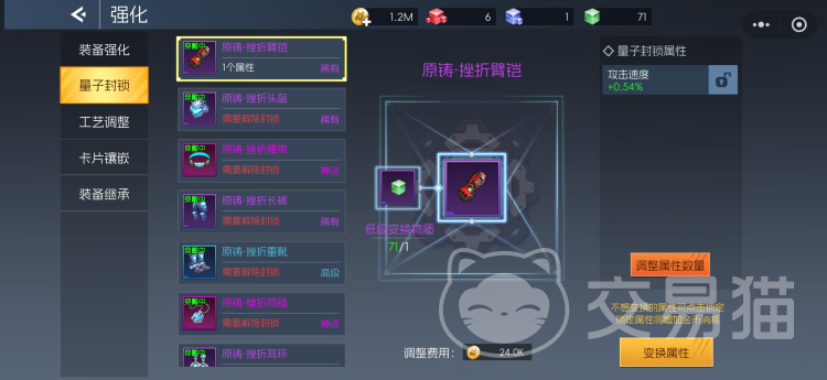 除基础强化外,强化面板还包含量子封锁、工艺调整、卡盘向前、效果重铸和装备继承等多项进阶功能。其中,量子封锁可视为强化的高阶形态,能为装备解锁额外属性加成,但同样需要消耗特定材料与金币;工艺调整则专注于优化晶体配置,提升装备的整体制造水准。