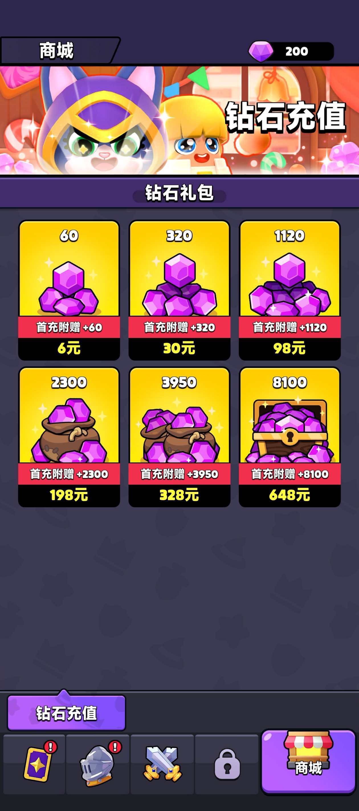 游戏中英雄获取的唯一途径为抽卡系统,所需道具包括抽卡券与钻石。其中抽卡券可通过正常通关流程逐步积累,而钻石则主要依赖充值获取。官方提供了多个档位的钻石礼包供玩家选择,共计6个不同价位配置,满足各类消费层次的需求。玩家可根据自身经济情况灵活挑选合适的充值档位,实现资源合理分配。