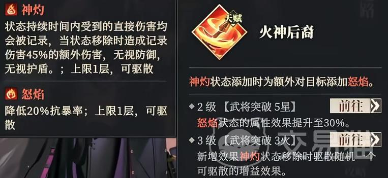 怒焰效果则为受击单位降低20%暴击抵抗率,同样限1层且可驱散。当祝融升至5星时,怒焰所附带的属性压制效果提升30%。激活3火后,新增机制为:神灼状态解除时,随机清除敌方一个可驱散的增益状态。