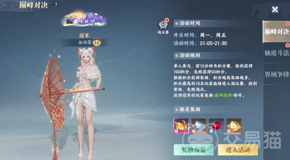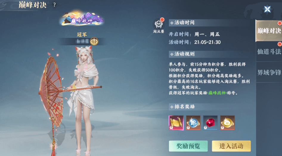 “巅峰对决”为周度限时高阶对抗玩法,每周一、周五晚21:05至21:30准时开启。该玩法采用单人入场制,全程分为两个阶段:前15分钟为积分积累期,胜者获100积分,败者得50积分;积分排名前16的玩家晋级后15分钟的单败淘汰赛。最终胜出者将被授予“巅峰战神”称号,并领取高额修为丹、稀有灵宠碎片及专属头像框。