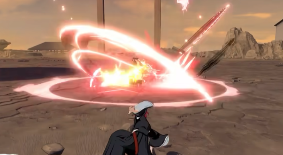 紧接切换至黑崎一护,立即释放大招「无月·终焉之剑」,召唤密集黑刃进行持续范围压制,期间全程处于无敌状态;大招结束后,利用一护普攻节奏快、硬直短的特点衔接高频平A,并配合精准翻滚避开Boss抬手动作,确保每一段输出完整命中。