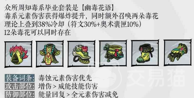 该体系的核心在于剧毒之花召唤物,它不仅能享受全部召唤增益效果,还具备智能锁定目标的能力。释放技能后几乎无需干预,角色便可自动进行持续输出。中毒状态可叠加层数,每层独立存在且持续4秒,配合冷却缩减机制,能实现全场范围内的高频毒伤覆盖。伤害表现极为可观,但需注意安达利遗产的适配性问题。毕业阶段首选套装为幽毒花语,这套专属于毒系的装备能够显著提升元素伤害,并额外生成两朵剧毒之花。若再搭配符文提供的30%冷却缩减、奥术囊甲带来的10%冷却缩减,最终叠加至38%的冷却缩减时,场上最多可同时存在12朵毒花,形成密集的毒伤区域。