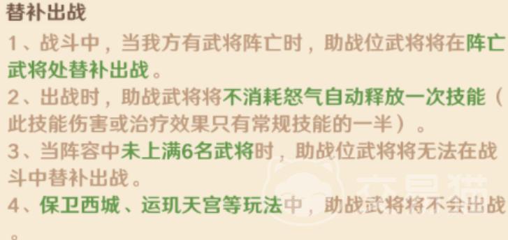 助战的核心逻辑是“一次释放,即时影响”。它不参与普攻循环、不积累怒气、不响应敌方状态变化,也无法被驱散或反制。这意味着:依赖多段触发、叠层增益、范围持续伤害或协同连携的技能,在助战位几乎无效;而具备大范围硬控、高额单体斩杀、群体净化或爆发治疗的武将,则能最大化发挥助战价值。