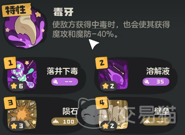 多多的核心特性是“毒牙”,该特性具备实战意义。当成功使对手进入中毒状态后,能够降低对方的魔法攻击与魔法防御能力。这一效果在对抗以法术输出为主的精灵时尤为有效。由于多多自身擅长施加中毒状态,因此该特性的触发频率较高,能够在战斗中持续发挥作用。