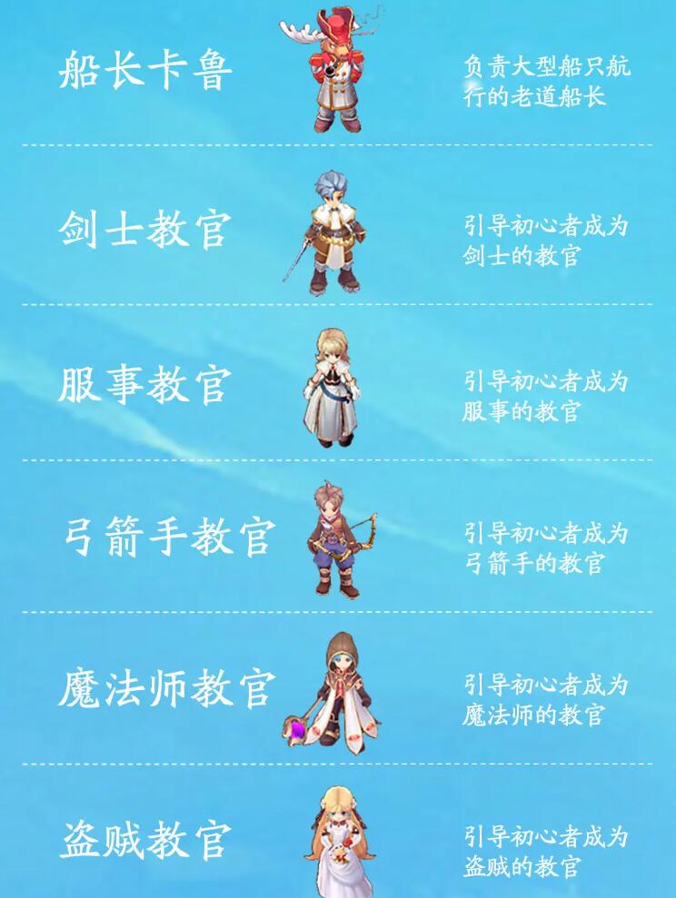 职业培养系统由五位专属教官协同支撑:剑士教官、服侍教官、弓箭手教官、魔法师教官与盗贼教官,分别对应五大基础职业路径,提供转职审核、技能树解锁及资质测试服务。此外,航行系统由资深船长卡鲁主导,其掌管大型船只调度与跨地图海域传送功能,是探索时空裂隙副本及远征资源点的核心枢纽。