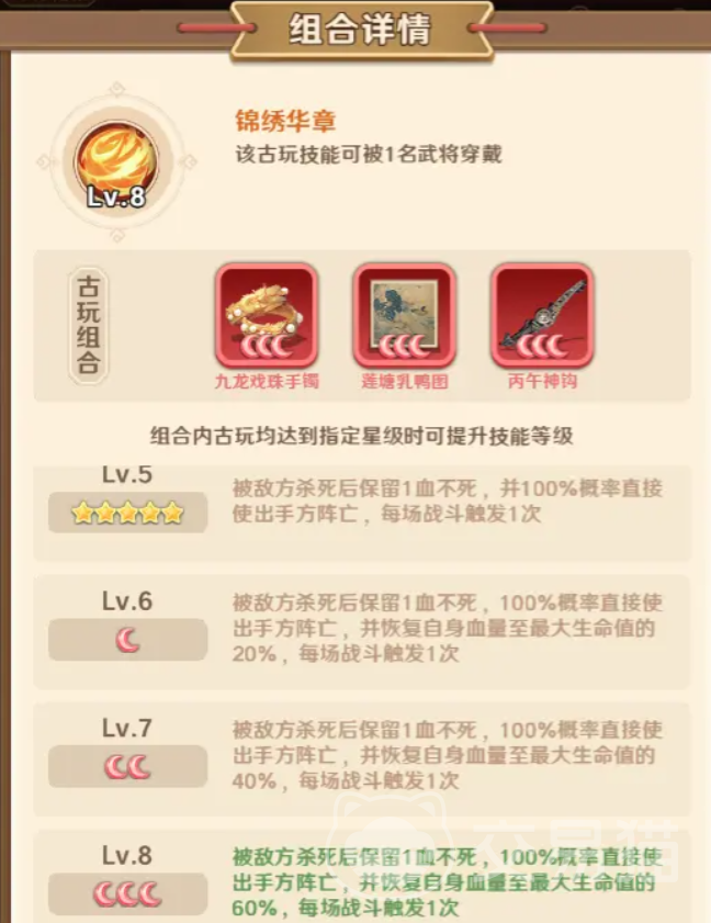 由莲塘乳鸭图、九龙戏珠手镯与丙午神钩激活。其核心效果为:当佩戴者受到致命伤害时,强制保留1点生命值,避免当场阵亡;同时100%反制击杀者,使其立即死亡;并额外恢复自身60%最大生命值。该免死+反杀+回血三位一体机制,单场战斗限触发一次,对高爆发输出型武将具备极强的容错加成与翻盘潜力,建议优先装配于队伍核心DPS位。