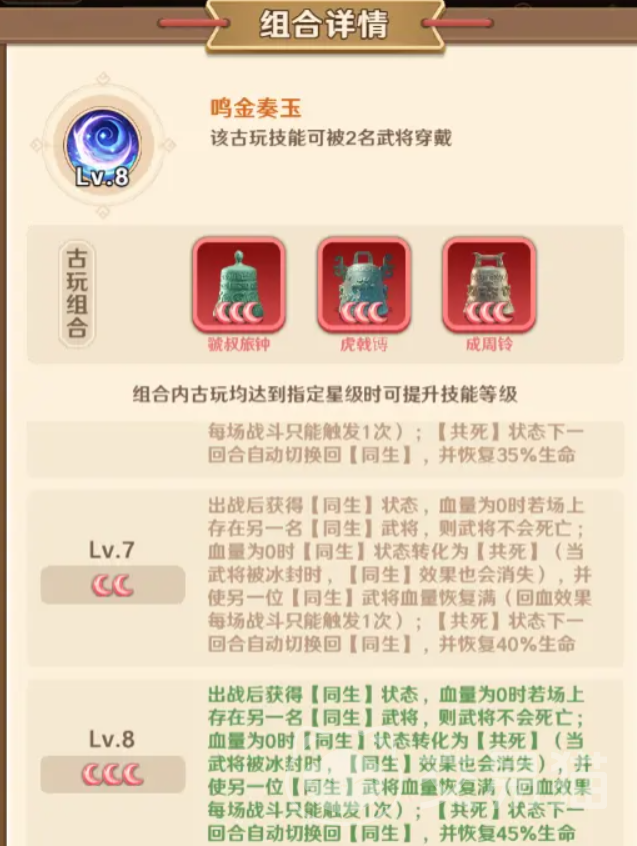 由虢叔旅钟、虎戟镈与成周铃组成。激活后,佩戴该组合的武将在登场即获得“同生”状态。若战斗中某位“同生”武将生命值归零,而场上尚存另一名处于“同生”状态的友方单位,则该武将不会阵亡,并自动触发状态转化——“同生”升级为“共死”。此时,存活的另一位同生武将将立即恢复至100%最大生命值。该效果整场战斗仅可触发一次。整体而言,该组合构建了双核生存保障机制,尤其适合绑定主C输出与核心治疗/护盾类辅助,形成攻守一体的稳固阵型。