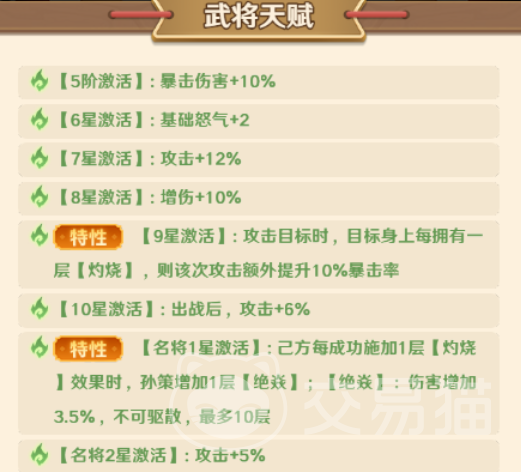 其天赋机制围绕灼烧层数展开:敌方每存在1层灼烧效果,孙策自身暴击率即提升10%;达成1星后,我方任意武将施加灼烧时,孙策自动获得1层“绝焱”状态,每层提升3.5%最终伤害,最多叠加10层;升至3星后,当绝焱叠至4层时,暴击伤害提升50%;叠满8层则可在释放技能时恢复一定生命值;晋升为神将并激活1星后,若目标身带灼烧,其技能命中时将额外引爆该状态,造成一次独立计算的高额附加伤害。