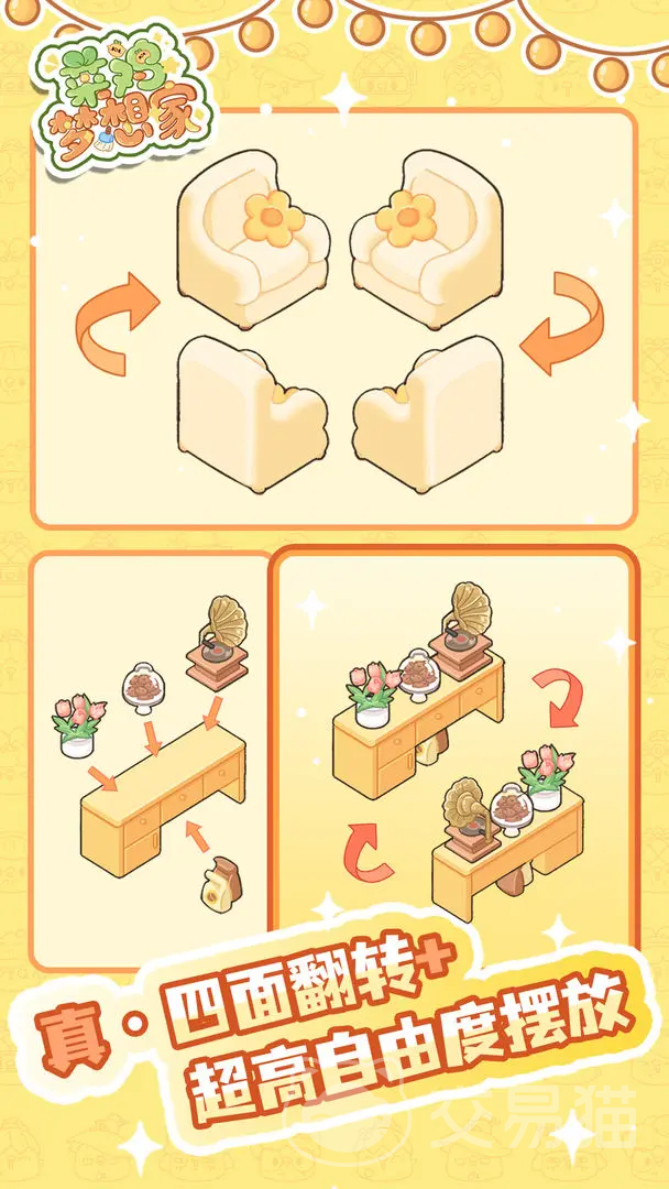 区别于传统格子式摆放机制,本作提供真正意义上的高自由度空间操作:家具支持360°四向旋转,且可在任意表面(包括沙发、窗台、户外地面)直接放置并实时翻转;更突破性地允许移除房屋结构,将家具直接布设于开放基地之上,实现无边界创意表达。