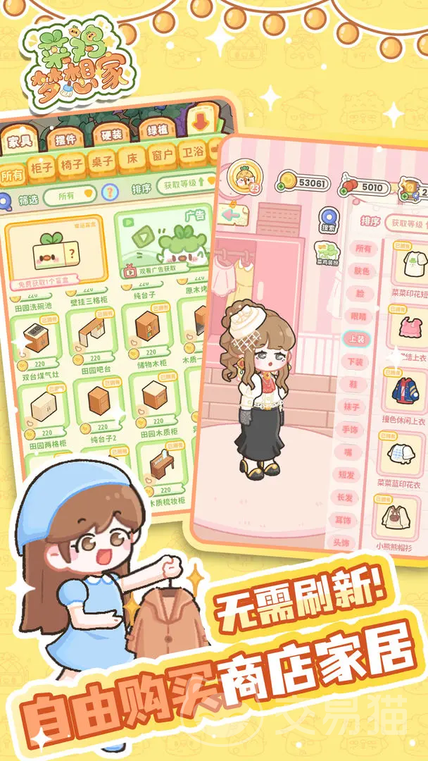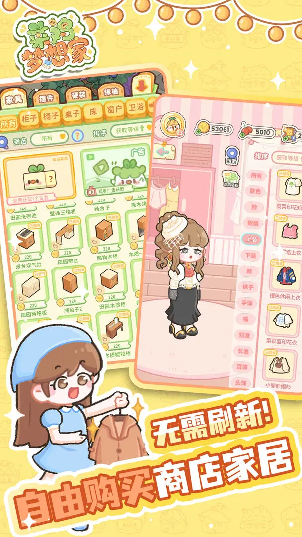 《菜鸡梦想家》是一款主打自由建造与生活模拟的休闲向手游,玩家将置身于一个由人类与拟人化“菜鸡”共同居住的温馨世界。游戏以房屋装修为核心体验,通过收集海量风格各异的家具,随心布置室内空间——无论是现代简约、复古怀旧,还是童话梦幻风,都能轻松实现。