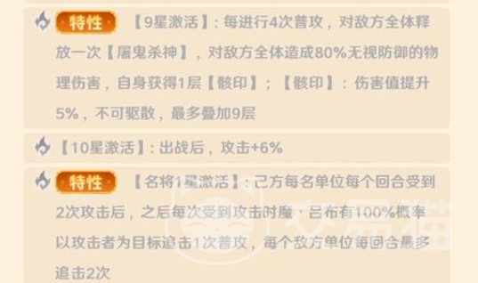 此外,每次触发四连普攻后,自身获得1层【怒焰印记】,每层提升5%总伤害,最多可叠加至9层。名将品质达1星时,当己方全体在单回合内累计承受2次伤害后,后续每次受击,魔吕布将立即对施加伤害者发动一次追击;升至3星后,队友暴击攻击有概率额外触发一次普攻;晋升为神将且达到1星时,若目标带有护盾效果,则对其造成的伤害额外提升20%。