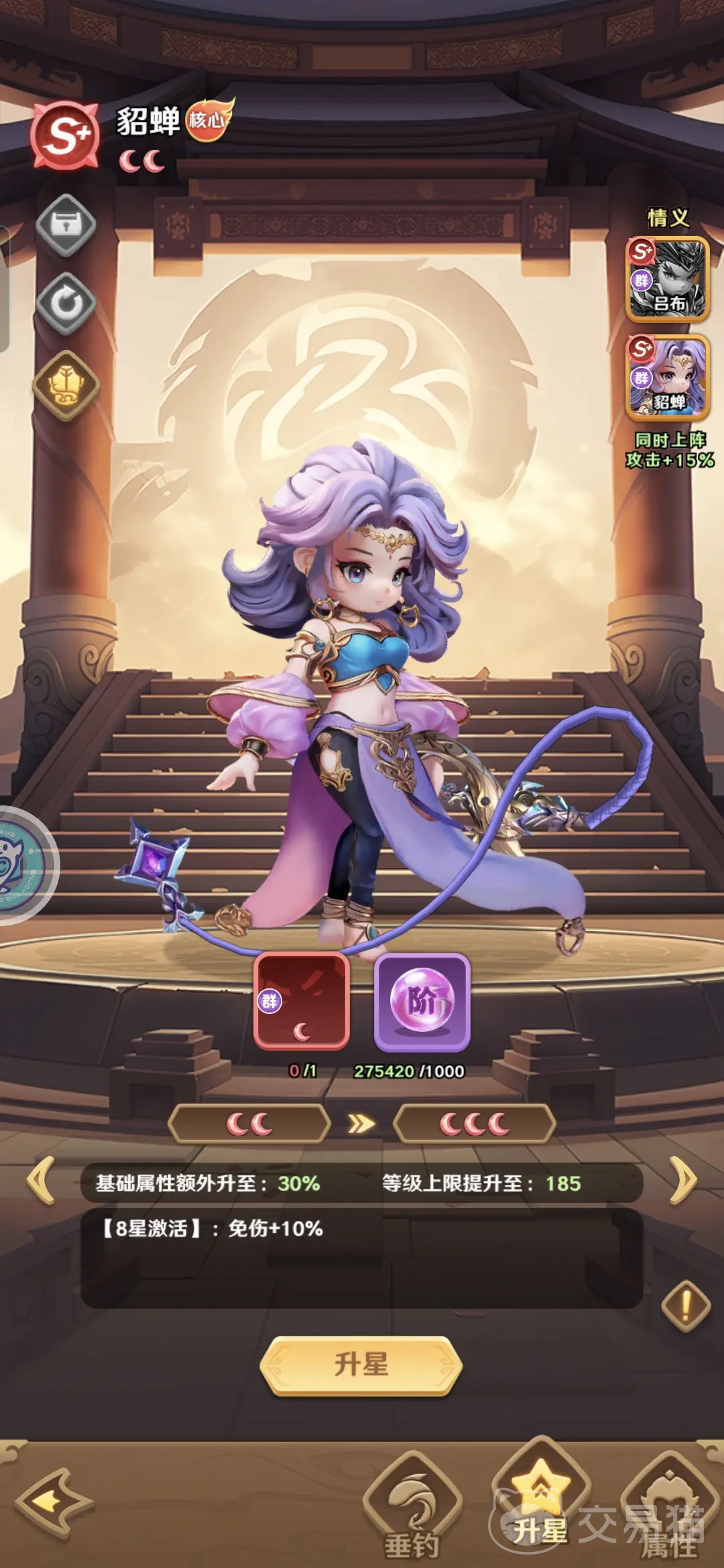 神貂蝉则聚焦于战局控制与团队减伤。相较于基础版,其控怒能力显著强化。普攻除常规伤害外,可对目标附加“闭月”效果,最高降低其50%所受伤害,有效缓解前排压力。主动技能可同时对至多3名敌方单位施加“魅惑”,干扰对方行动节奏与怒气积累,具备极强的群体压制力,适用于多核输出或持久战场景。