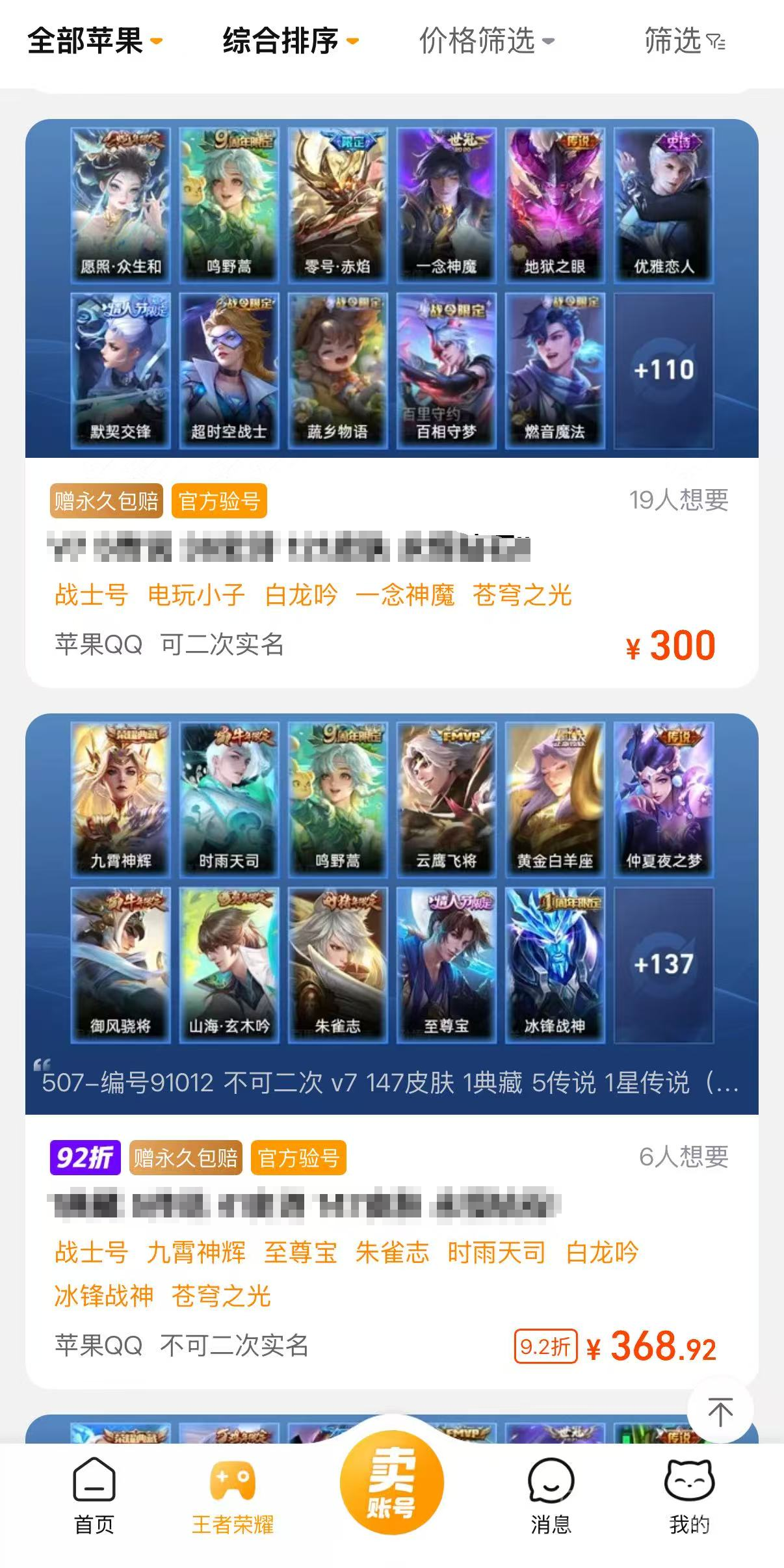 想要找到实惠的王者贵7号就来交易猫吧,里面的贵7账号价格从几百元到几千元不等,便宜的贵7账号只要三百多元就能拿下。除了V7账号,里面还有V10账号、满传说皮肤账号等等,种类繁多,价格绝对公正实在。安卓手机点击上方按钮下载软件,苹果手机用浏览器搜索交易猫官网也能在官网里正常交易。