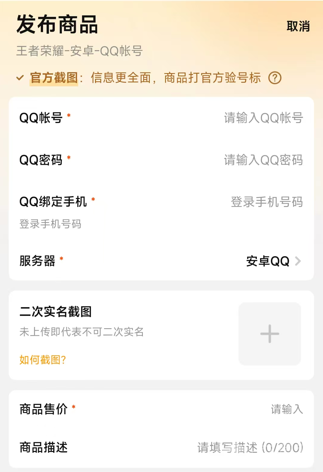 接着就是售卖流程还是很简单的,玩家们点击下方的售卖功能,将需要售卖的游戏打包出售,在出售的过程中请准确填写售卖的区服以及账号性质,尤其是账号和密码要确定没有出错,还有就是售卖的价格以及对应的游戏截图,这样才能确定后面交易的流畅性,也可以更快地出售自己的账号。