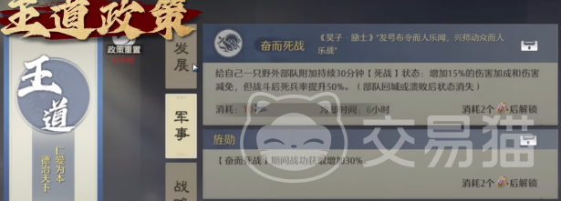 王道技能侧重于战斗维度的质变提升。更戌易帜支持动态更换守军兵种,使其切换为克制目标地形的类型,在进攻高级土地时大幅降低伤亡率;死战提供15%攻击与防御增益,但同步带来50点死兵率上升,属于典型的高风险高回报型技能——满级后还可额外获取30%战功,并减少虎符消耗,建议在大型攻城战或国战阶段集中启用。
