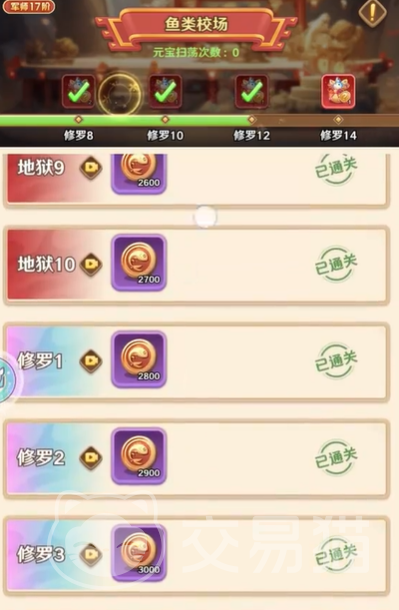 游戏内鱼按品质划分为四个等级,对应紫、黄、红、青四种主色调。颜色越靠后,基础属性越高,成长潜力越强,获取难度也同步上升。其中紫色与黄色鱼为入门级资源,适合所有新手稳定积累。主要产出途径为每日历练中的铜钱校场及专属鱼类校场——完成关卡即可获得小礼袋,开启后有概率直接获取紫鱼或黄鱼,或获得鱼币用于后续兑换。该方式门槛低、频率高、可持续性强,是平民玩家前期最可靠的资源来源。