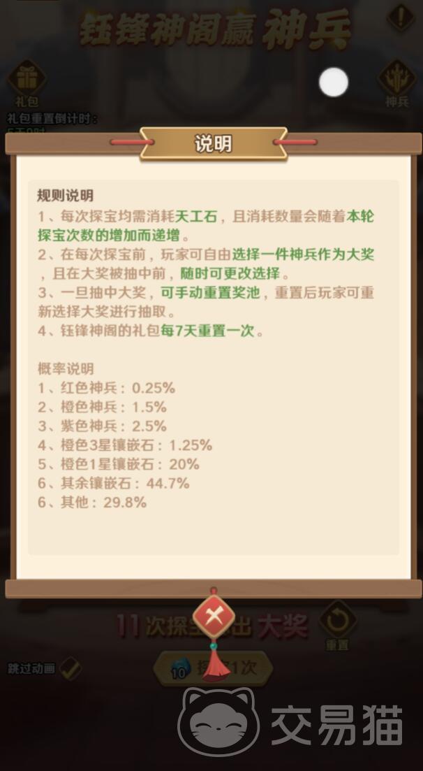 为保障玩家长期投入的确定性收益,系统内置保底机制:每累计进行15次探宝操作,必定获得一次大奖。该设定有效降低欧非差异带来的体验落差,使资源规划更具可预测性。同时,官方明确公示各品质神兵的抽取概率,例如红色神兵基础掉落率为0.25%,镶嵌石等配套材料亦有对应概率说明,便于玩家科学评估投入产出比。