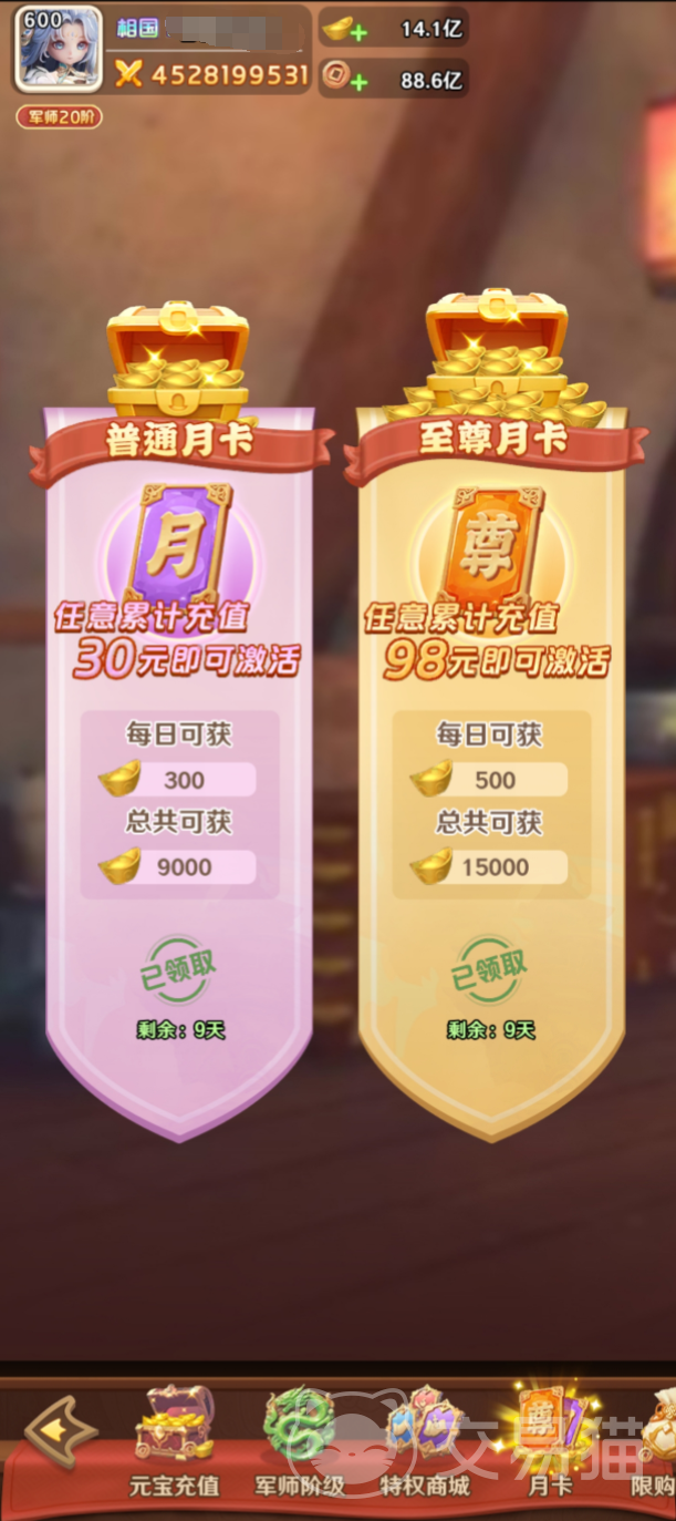 月卡体系为长期玩家提供了高性价比选择:普通月卡售价30元,每日返还300元宝;至尊月卡售价98元,每日返还500元宝。两类月卡均持续30天,支持多次续购,元宝可用于购买体力、加速培养、兑换稀缺道具等高频消耗场景。