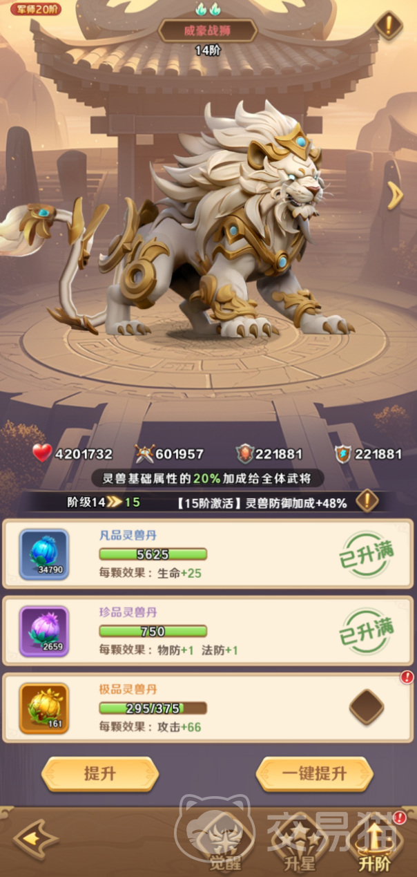 豪威战狮:定位为高泛用性输出型灵兽,适用于绝大多数PVE场景。其核心机制在于技能释放后可为全体武将提供怒气值增益,同时提升全队伤害、暴击率与暴击伤害。该效果显著加快技能循环节奏,尤其利于依赖怒气释放大招的主力武将。建议玩家集中资源将其升至6星,以激活关键被动技能,实现战力跃升。