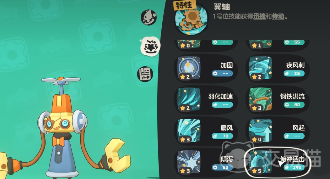帕帕斯卡的战场定位清晰:依托九个细别相性的抗性覆盖实现高容错站场,并以持续输出压制对手节奏。其专属特性“翼轴”赋予1号位技能双重效果——迅捷与传动。“传动”指回合结束时,该技能自动向后顺移一位,导致技能栏位置动态变化,需玩家实时掌握当前序列,否则极易误判释放窗口。辅助技能“轴承支撑”置于2号位最为合理,触发后可使相邻技能消耗降低2点PP,结合传动机制,能精准调控关键技能的释放频率与资源分配。