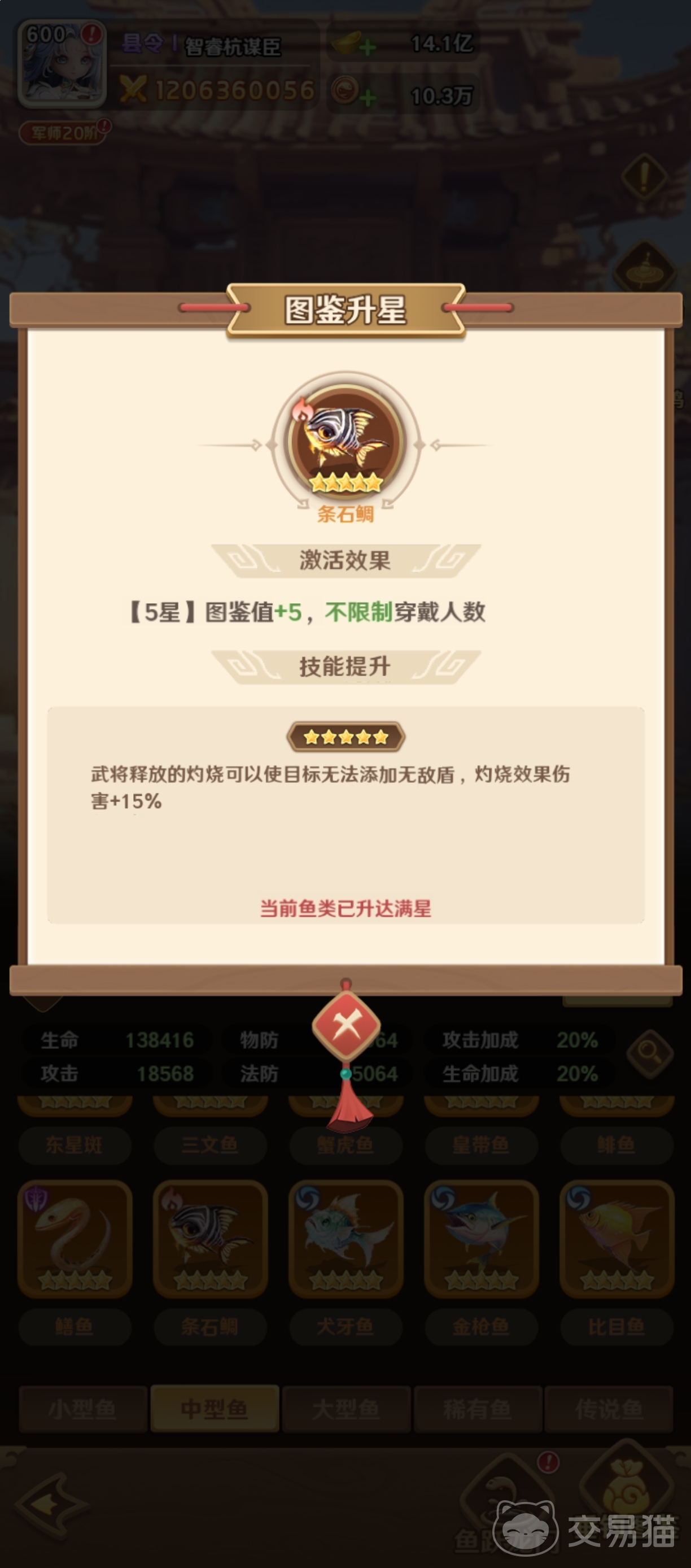 进阶选择条石鲷:中型鱼类中性价比突出的灼烧专精配置。除提升灼烧基础伤害外,还附带特殊机制——使灼烧效果生效时,目标无法获得无敌盾状态。该特性有效克制当前版本主流护盾流敌方配置,大幅削弱对手生存韧性,在PVE高难本及PVP对抗中具备战术级价值。