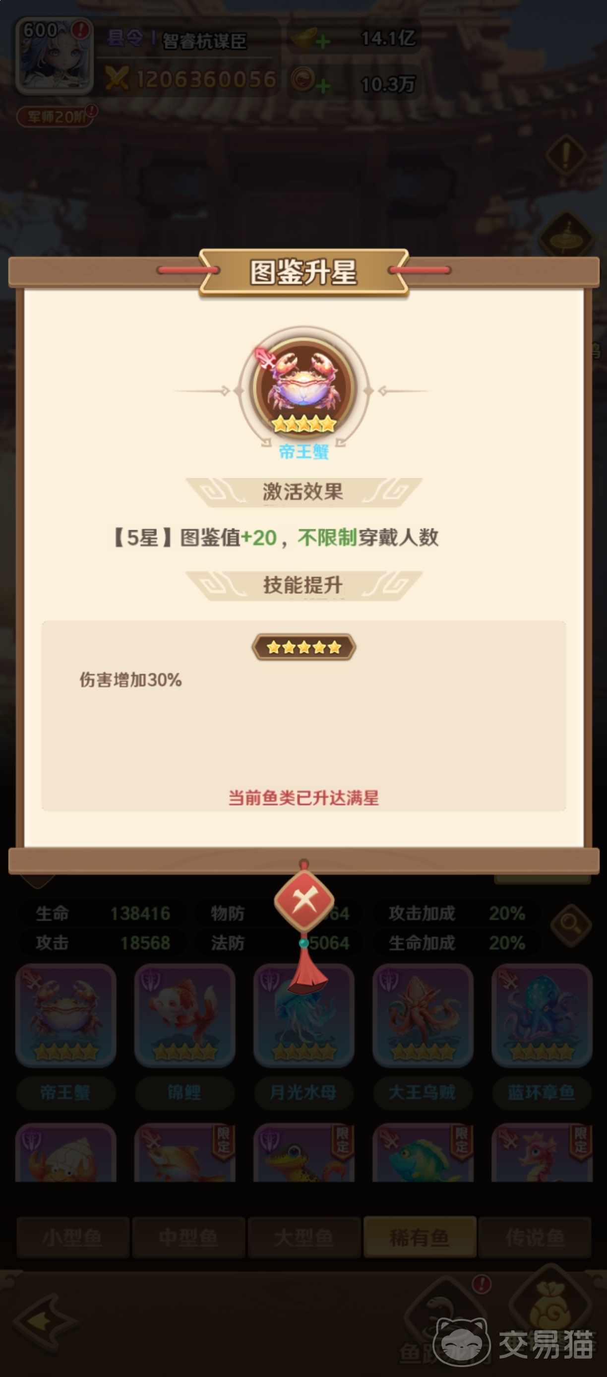 备选帝王蟹:提供基础攻击力加成,适用于缺乏全局增伤手段的过渡期阵容。其属性加成为直伤型提升,不改变灼烧机制本身,因此在灼烧队成型后优先级低于功能型鱼类。建议仅在资源有限、急需短期战力突破时启用。