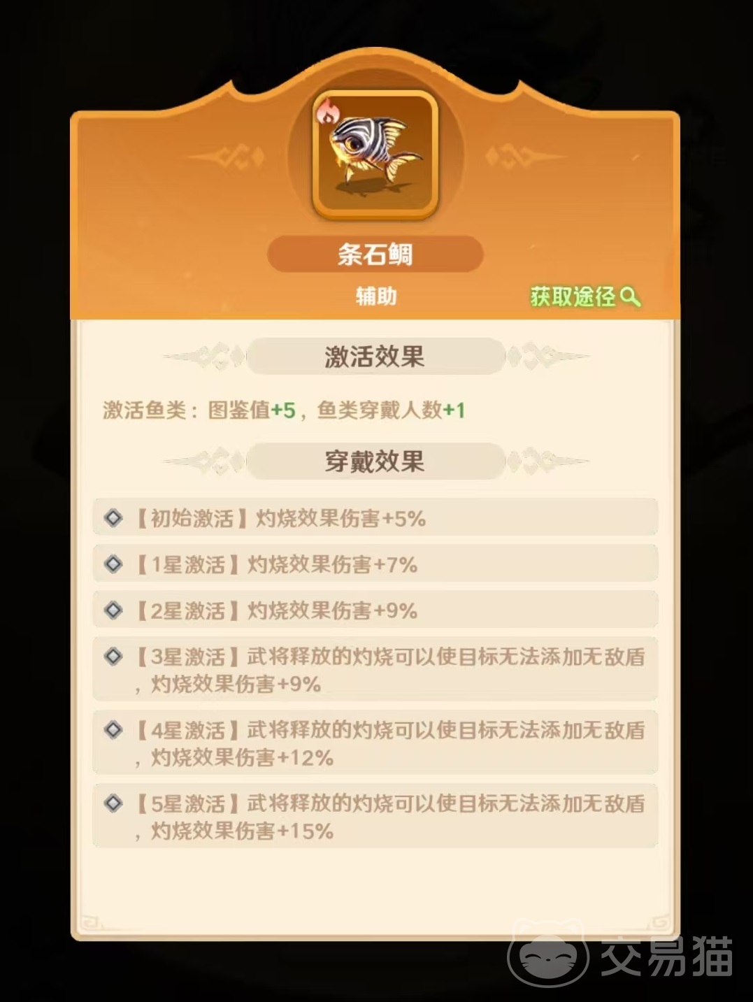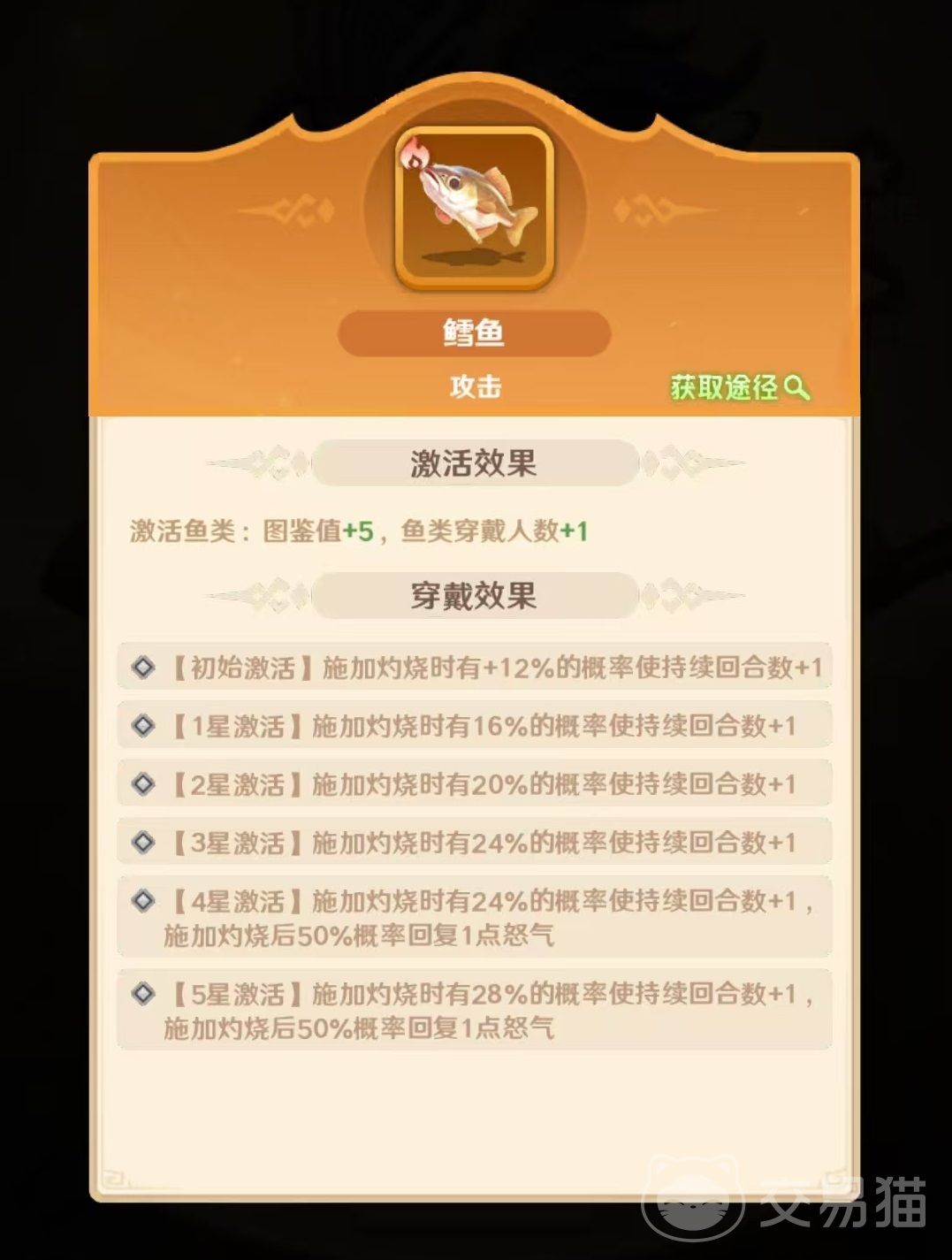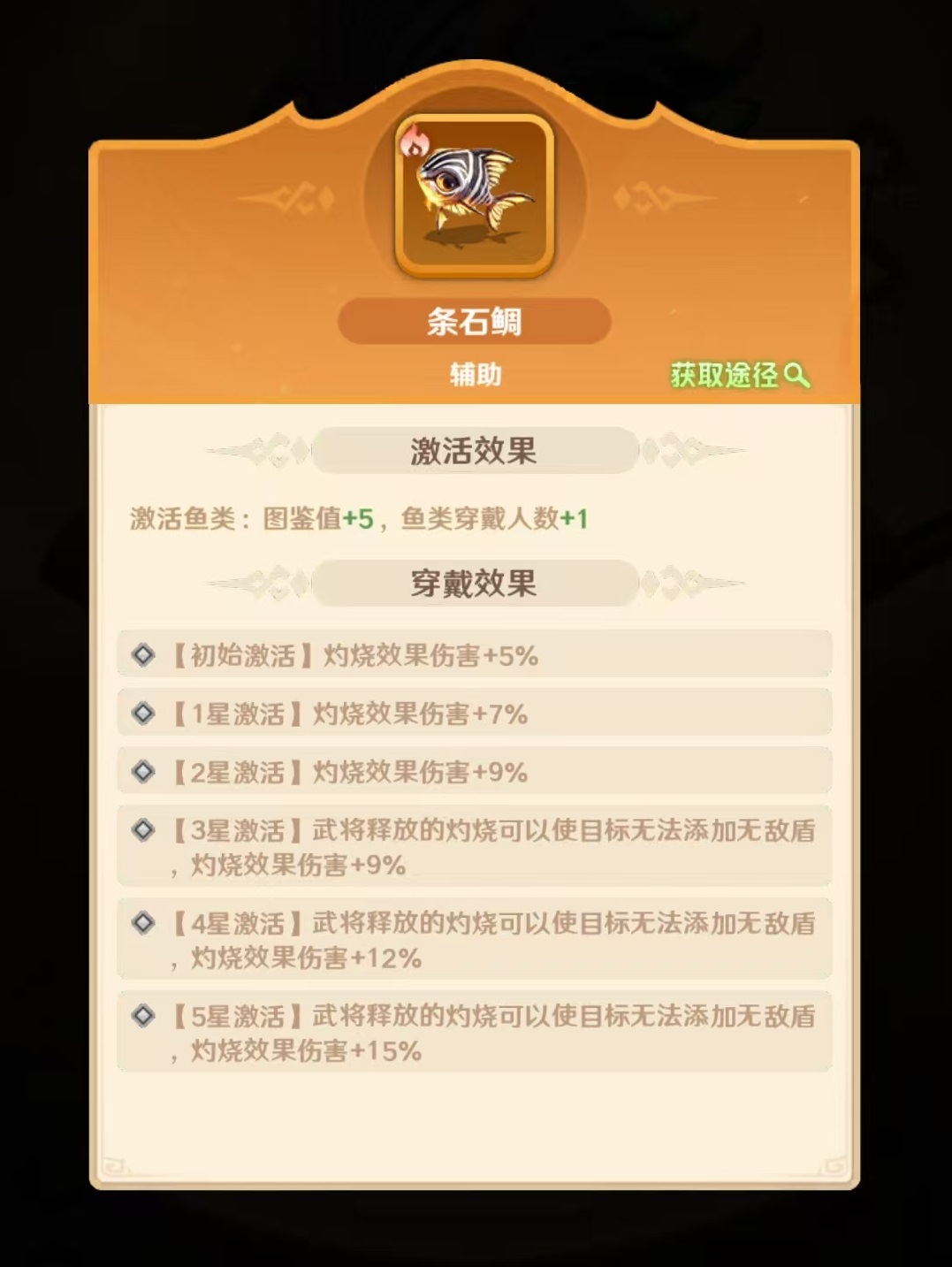 其他可选鱼类需严格匹配角色站位与功能分工。例如三文鱼虽具备“受击时概率对攻击者施加2回合灼烧”的特性,但该效果更适配前排承伤单位,用于周瑜自身收益偏低;同理,鲟鱼“阵亡时概率对全体敌人附加灼烧”属于团队型触发技,建议优先装配于孙策、孙权等高承伤或高牺牲价值的前排角色,以最大化群体点火效率。至于大型鱼类,目前尚无直接强化灼烧机制或与周瑜技能链形成正向协同的类型,因此若需选用,应转向生存向属性补强方向,如提升生命上限、减伤率或受控抵抗等通用生存维度。