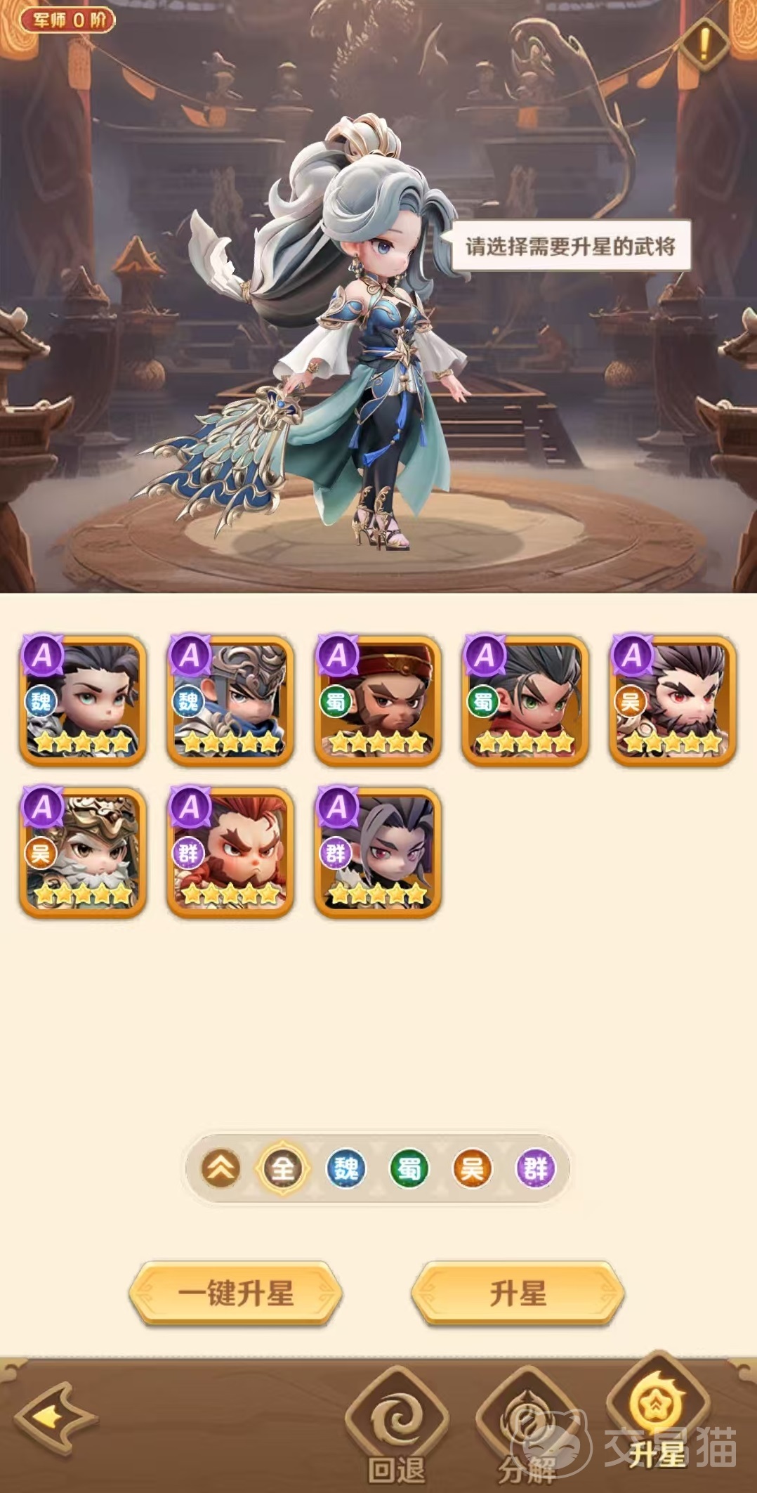 武将连接系统是本作关键减负机制之一。所有上阵角色均可绑定至一名核心武将,当该核心升星时,其余绑定武将将自动同步星级,大幅降低材料消耗。因此,资源投放必须高度聚焦:输出向核心锁定关羽、司马懿、周瑜;辅助向核心则优先培养曹操、刘备、蔡文姬。这些角色应集中获取突破材料、技能升级资源及升星道具,其余武将仅需完成基础连接,无需额外投入养成资源。同时,务必注意阵营搭配逻辑——三人及以上同阵营出战即可激活专属光环,带来全队生命、攻击、暴击等维度的显著增益。