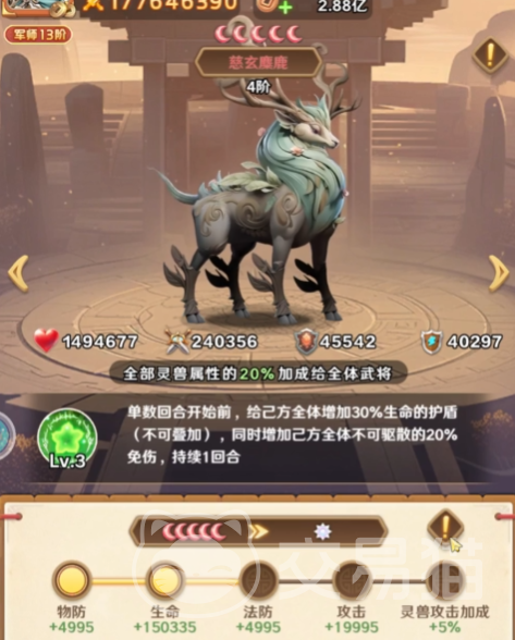 进入中期,队伍框架趋于稳定,灵兽选择重心转向功能协同。玄鹿与麋鹿侧重生存维度强化,在面对高难度BOSS或竞技场高强度对抗时尤为关键:玄鹿的闪现救援机制可在队友濒危瞬间将其拉回安全位置并触发治疗,大幅提升容错率;麋鹿则提供护盾保护,配合减伤类武将形成双重防御体系;黄金兽兼具威慑与增益双重特性,既能削弱敌方输出,又能提升自身攻击,适配高速速攻流或爆发输出流等多种主流配队思路。